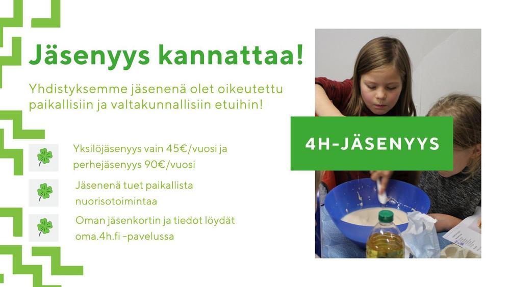 Tervetuloa mukaan iloiseen, monipuoliseen ja kehittävään 4H-toimintaan. 4H-jäsenyys on huippujuttu! Jäsenenä voit osallistua kaikkeen toimintaan, saat jäsenetuja ja paikallisia alennuksia. Lisäksi sinulla on tapaturmavakuutus 4H-tilaisuuksissa.