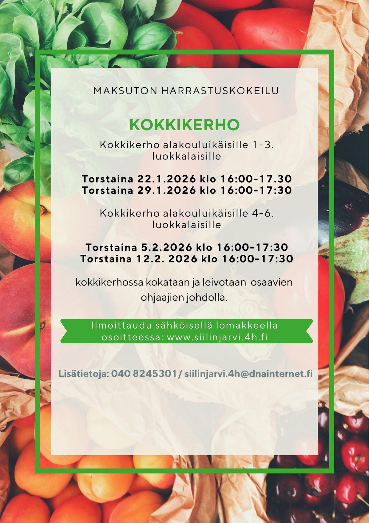 Tule harjoittelemaan kokkaustaitoja maksuttomaan harrastuskokeiluun! Kerhossa teemme erilaisia ruokia ja leivonnaisia osaavien ohjaajien johdolla.